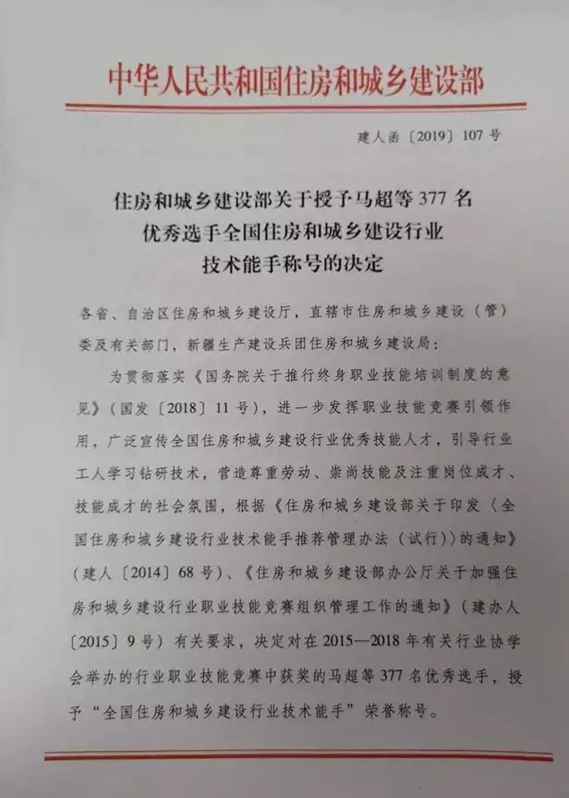 近日,住建部對在2015—2018年有關行業協學會舉辦的行業職業技能競賽中獲獎的優秀選手,授予“全國住房和城鄉建設行業技術能手”榮譽稱號,我司員工程連濤喜獲此殊榮。