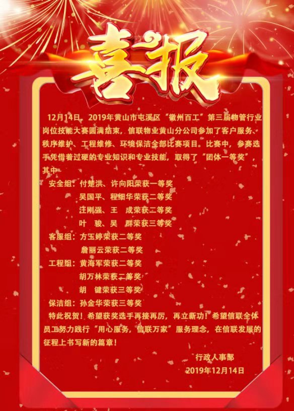 2019年12月14日,冬日里的陽光如一縷縷炫目的光芒,彌漫于一望無際湛藍的蒼穹,在這個溫暖的季節(jié),信聯(lián)物業(yè)的十八名各個崗位的精英來到屯溪區(qū)“徽州百工”第三屆物管行業(yè)崗位技能大賽的現(xiàn)場,將向全區(qū)人民群眾展現(xiàn)信聯(lián)物業(yè)的崗位風采與精神面貌。