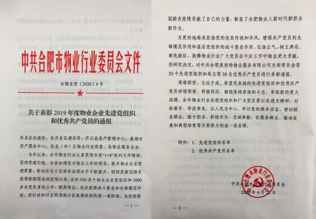 6月24日,“合肥市深化黨建引領、全面提升物業工作水平”大會在合肥梅山飯店隆重召開。會議對合肥市物業行業的黨建工作及疫情防控等工作進行了總結和部署,并對抗疫工作成效突出的黨支部、物業企業、物業管理項目、物業工作者等進行通報與表彰。