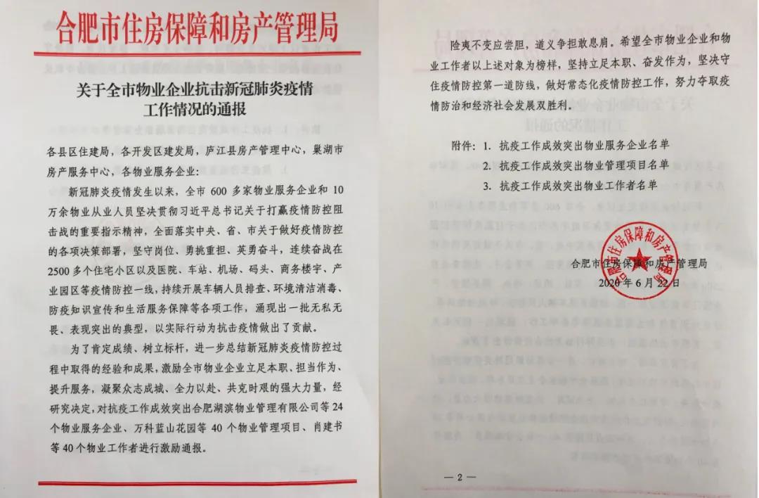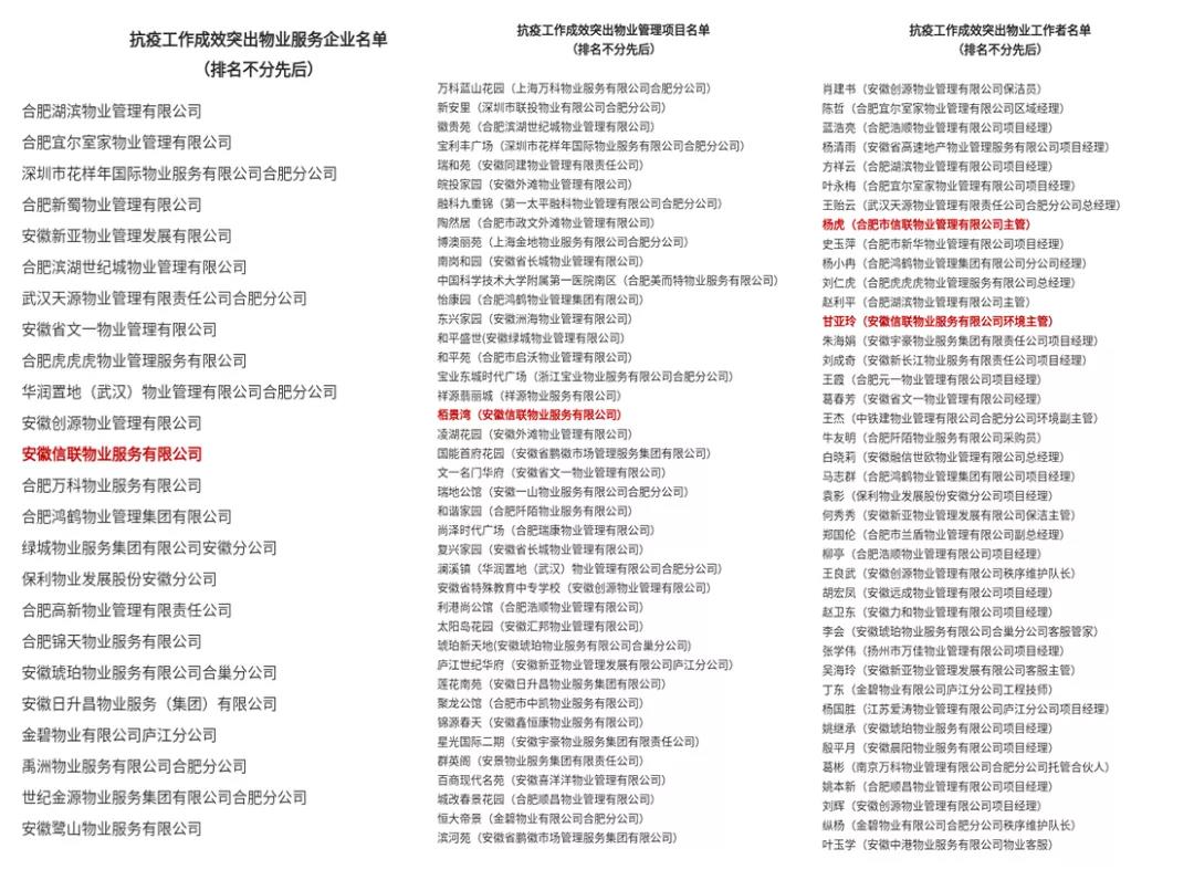 其中安徽信聯物業服務有限公司榮獲“抗疫工作成效突出物業服務企業”,栢景灣項目榮獲“抗疫工作成效突出物業管理項目”,楊虎、甘亞玲榮獲“抗疫工作成效突出工作者”榮譽!