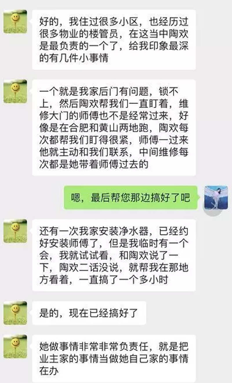 業主徐先生說陶歡的服務很人性化,而且非常堅持原則,當時他家裝修的時候,裝修師傅沒有按消防要求將煙感探測器進行恢復,出于對業主的安全考慮,陶歡一直緊盯不放,這讓徐先生覺得住在這樣的小區里很安心。