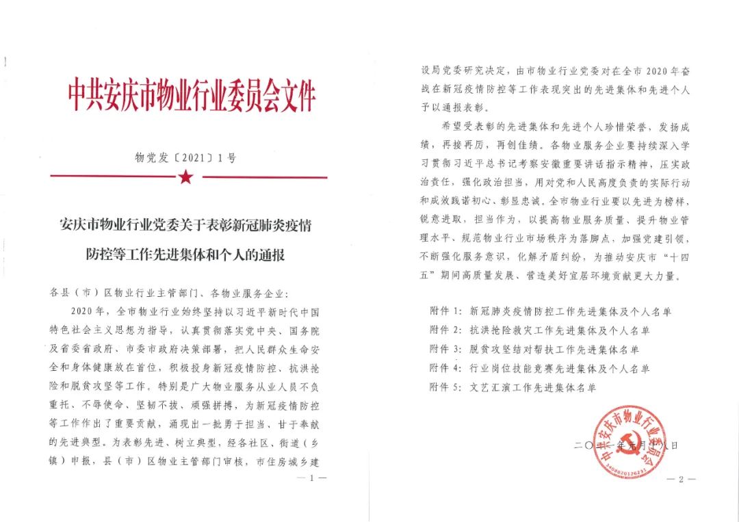 1月18日,中共安慶市物業行業委員會發布《關于表彰新冠肺炎疫情防控等工作先進集體和個人》通報文件,對全市2020年奮戰在新冠疫情防控等工作表現突出的先進集體和先進個人予以通報表彰,安徽信聯物業安慶分公司榮獲多項先...